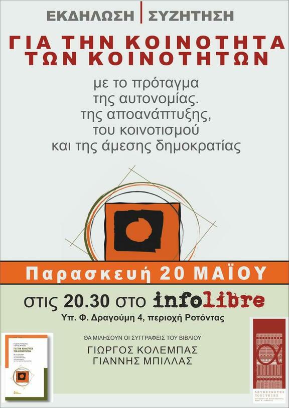 Ένας νέος κύκλος εκδηλώσεων και συζητήσεων αρχίζει στο χώρο του infolibre.gr - συνεργατική για την ανεξάρτητη ενημέρωση και επικοινωνία. Την Παρασκευή, 20/5 στις 20.30, οι Γιώργος Κολέμπας και Γιάννης Μπίλλας θα μιλήσουν για το βιβλίο τους Για την Κοινότητα των Κοινοτήτων, με το πρόταγμα της αυτονομίας, της αποανάπτυξης, του κοινοτισμού και της άμεσης δημοκρατίας.