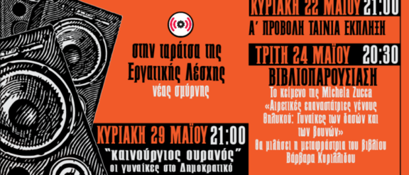 -Την Κυριακή 29/5 στις 9.00μμ προβολή της ταινίας "Καινούργιος ουρανός. Οι γυναίκες στο Δημοκρατικό Στρατό Ελλάδας" , 75', Γιαννης Ξυδας& Τάσος Κωνσταντοπουλος (θα παραβρεθούν κ θα μιλήσουν συντελεστές της ταινίας).