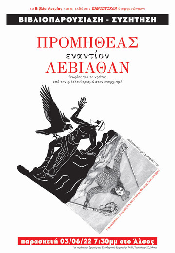 Η ομάδα διακίνησης εντύπων "Βιβλία Ανομίας" και οι εκδόσεις "ΠΑΝΟΠΤΙΚόΝ" διοργανώνουν βιβλιοπαρουσίαση-συζήτηση με αφορμή την έκδοση του νέου βιβλίου του Κώστα Δεσποινιάδη "Προμηθέας εναντίον Λεβιάθαν - θεωρίες για το κράτος από τον φιλελευθερισμό στον αναρχισμό".