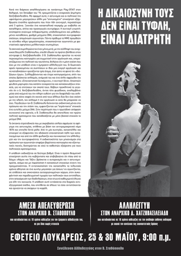 Η υπόθεση εκδικάζεται σε δεύτερο βαθμό στις 18 Μαΐου. Είναι η πρώτη θεαματική επιχείρηση αυτής της κυβέρνησης και επιβεβαιώνει ότι πίσω από το δόγμα «νομός και τάξη» βρίσκεται ο αυταρχισμός και η αστυνομοκρατία, ακόμα και με παραποίηση ή κατασκευή στοιχείων έναντι της πραγματικότητας. Η εντατικοποίηση της καταστολής τα τελευταία χρόνια οδήγησε σε ένα κυνήγι μαγισσών για όσους αγωνίζονται, σε επιθέσεις και εκκενώσεις αυτοοργανωμένων χώρων, στην συκοφάντηση και παραδειγματική τιμωρία των πολιτικών τους αντιπάλων, στην απαγόρευση των διαδηλώσεων, στον στυγνό καθημερινό έλεγχο για όλη την κοινωνία. Η υπόθεση αυτή εντάσσεται στο διαρκές αντι-εξεγερσιακό σχέδιο, που επιτίθεται σε όλους/-ες όσοι αντιστέκονται και αρνούνται να σκύψουν το κεφάλι.
