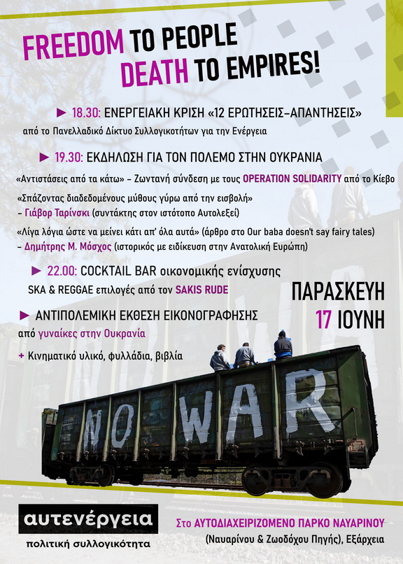 - «Αντιστάσεις από τα κάτω»: Ζωντανή σύνδεση με τους OPERATION SOLIDARITY* από το Κίεβο. Ο παρευρισκόμενος κόσμος θα έχει την ευκαιρία να απευθύνει απευθείας ερωτήσεις.