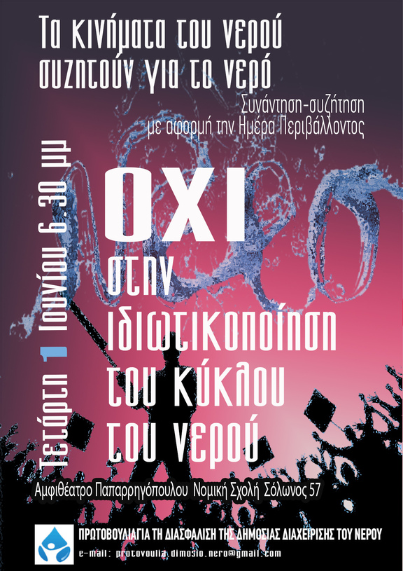 Στo πλαίσιo εκδηλώσεων για την Παγκόσμια Ημέρα Περιβάλλοντος (5 Ιουνίου) οργανώνουμε συνάντηση συλλογικοτήτων, κινημάτων και πολιτών για να συζητήσουμε για το νερό, τη διαχείριση και εκμετάλλευσή του και ειδικότερα για την ιδιωτικοποίηση του κύκλου του νερού.