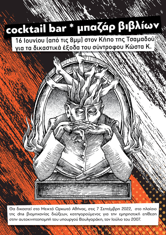 cocktail bar / μπαζάρ βιβλίων, στις 16 Ιουνίου, στον Κήπο της Τσαμαδού, για τα δικαστικά έξοδα του σύντροφου Κώστα Κ.
