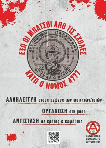 - Κατάργηση του νόμου 4777 (Κεραμέως- Χρυσοχοίδη). Κανένα πειθαρχικό, καμία διαγραφή, κανένας μπάτσος μέσα στις σχολές μας.
