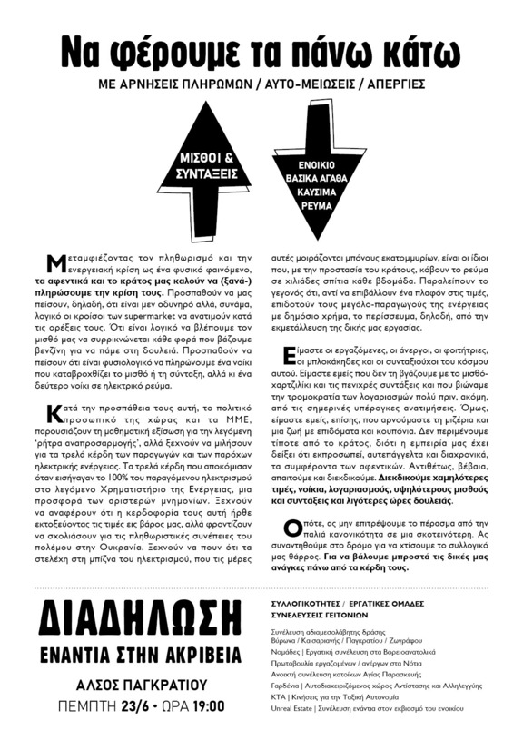 Η ενεργειακή κρίση αποτελεί συνέχεια της υγειονομικής, δηλαδή μια απόπειρα διαχείρισης των αδιέξοδων που δημιουργεί ο καπιταλισμός μέσα από τη συνέχιση της επίθεσης στις ζωές μας: Απέναντι στα κύματα αποβλάκωσης που ξερνούν τα χρυσοπληρωμένα μέσω της "λίστας Πέτσα" ΜΜΕ, αλλά και τις άναρθρες κραυγές των φασιστών, οφείλουμε να διατηρήσουμε την κριτική μας σκέψη, ενώνοντας τις τελείες τις κρίσης έτσι ώστε να διακρίνουμε τον εχθρό μας στο πρόσωπο των κρατών, των πολυεθνικών ομίλων και εν γένει τον κόσμο του κεφαλαίου. Για να σώσουμε πραγματικά την υγεία μας, υπερασπιζόμενοι/ες την αξιοπρέπεια και την ελευθερία μας, πρέπει να σπάσουμε την επιβαλλόμενη απομόνωση, υλική/ψυχολογική εξαθλίωση και κατασταλτική περικύκλωση, φτιάχνοντας κοινότητες αγώνα που θα επιβάλλουν να πληρώσουν το κόστος της κρίσης τα αφεντικά. Να πληρώσουν κεντρικά πολιτικά, αλλά και όπου τα συναντάμε στις δουλειές και τις γειτονιές μας, μέσα από ένα κίνημα για:ΑΥΞΗΣΕΙΣ ΜΙΣΘΩΝ ΚΑΙ ΣΥΝΤΑΞΕΩΝ-ΑΡΝΗΣΗ ΠΛΗΡΩΜΩΝ-ΑΥΤΟΜΕΙΩΣΗ-ΝΑ ΜΗ ΖΗΣΟΥΜΕ ΜΙΑ ΖΩΗ ΜΕ ΔΟΣΕΙΣ ΚΑΙ ΕΛΕΗΜΟΣΥΝΗ ΑΝΤΙΣΤΑΣΗ-ΑΛΛΗΛΕΓΓΥΗ-ΑΥΤΟΟΡΓΑΝΩΣΗ