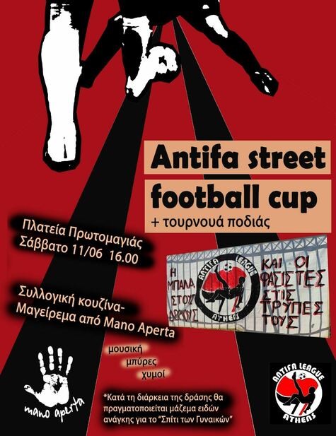 Σάββατο 11 Ιούνιου, ώρα 16.00 το Antifa League Athens μαζί με την συλλογική κουζίνα Mano Aperta συνδιοργανώνουν τουρνουά ποδοσφαίρου στην πλατεία Πρωτομαγιάς.