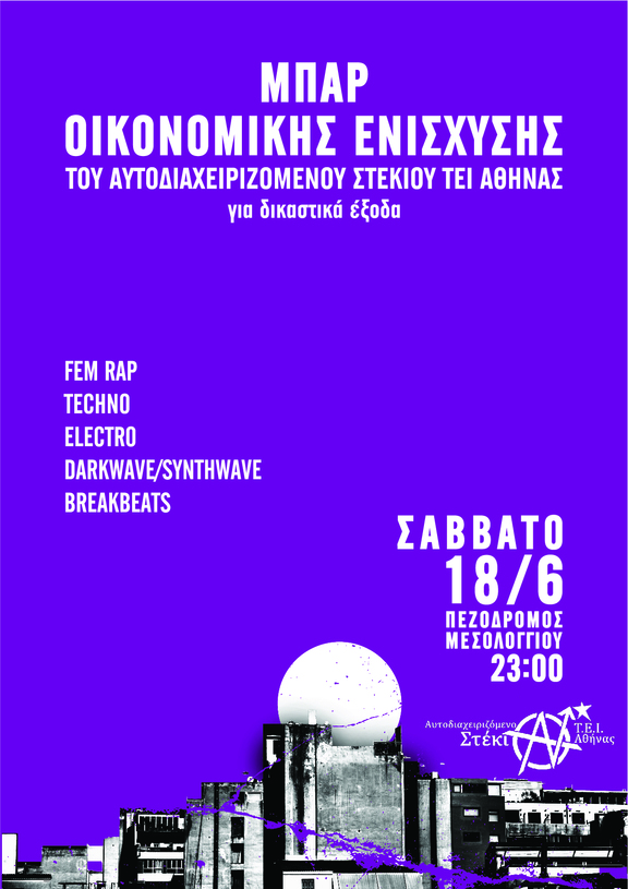 Το αυτοδιαχειριζόμενο Στέκι Τ.Ε.Ι. Αθήνας (αυτο)διοργανώνει μπαρ οικονομικής ενίσχυσης του στεκιού και για δικαστικά έξοδα στο πεζόδρομο της Μεσολογγίου.