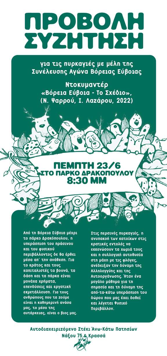 Από τη Βόρεια Εύβοια μέχρι το πάρκο Δρακόπουλου, η υπεράσπιση του πράσινου και του φυσικού περιβάλλοντος δε θα έρθει μέσα απ' την ανάθεση. Για το κράτος και τους καπιταλιστές τα βουνά, τα δάση και τα πάρκα είναι μονάχα χρήματα, επενδύσεις και εργατική εκμετάλλευση. Για τους ανθρώπους που τα ζούμε είναι η καθημερινή ανάσα μας, το μέσο της αυτάρκειας, είναι ο βιος μας.