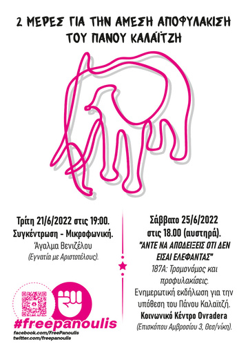 Η αστική δικαιοσύνη, με την αντίληψή της για τον σωφρονισμό των κρατουμένων και την επιλογή της για το ποιος θα «ζήσει» και ποιος θα πεθάνει στους τέσσερις τοίχους ενός κελιού, είναι ένα ειδος δικαιοσυνης στο οποίο δεν πιστέψαμε ποτέ. Δεν μπορούμε να μένουμε αμέτοχες σε αυτές τις σκευωρίες και τις δικογραφίες-φάρσες της δικαιοσύνης. Στεκόμαστε αλληλέγγυοι/ες/α στον κρατούμενο Πάνο Καλαιτζή και σε όσους αγωνιστές πολεμά το κράτος για ξεκάθαρες πολιτικές του σκοπιμότητες.