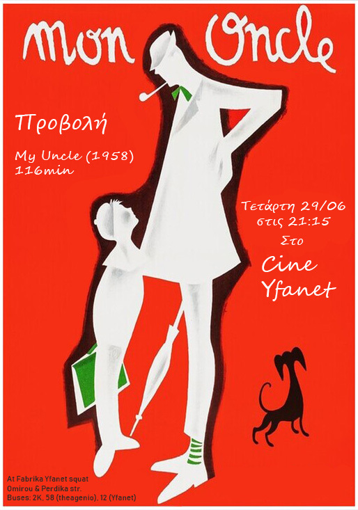 Τετάρτη 29 Ιουνίου στις 21:15 προβολή της ταινίας "Mon Oncle" (1958) του Jacque Tati από το Cine Yfanet