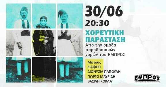 Η χορευτική ομάδα του Εμπρός παρουσιάζει για πρώτη φορά χορούς από όλη την Ελλάδα. Σας περιμένουμε στην πρώτη μας παράσταση-γιορτή. Παρέα μας θα έχουμε τους "Ζιαφέτι" με την Διονυσία Παπούλη και τον Γιώργο Μαυρίδη μαζί με τον Βασίλη Κοκλα. Η παράσταση μας θα γίνει στον χώρο του θεατρου (βεντάλιες νεράκια καλή διάθεση απαραίτητα). Θα ακολουθήσει γλεντι στην ταράτσα του Εμπρός ζωντανά με τους μουσικούς. Θα υπάρχει κουτί ελεύθερης συνεισφοράς για τα έξοδα των μουσικών. Στο μπαρ θα υπάρχουν μπύρες παγωμένες