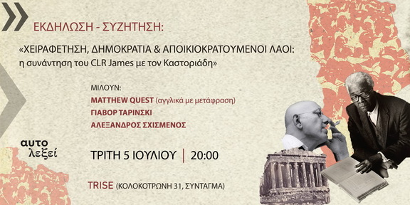 Ο ελευθεριακός ιστότοπος & εκδόσεις Αυτολεξεί σας προσκαλεί στη δημόσια εκδήλωση-συζήτηση: «Χειραφέτηση, δημοκρατία & αποικιοκρατούμενοι λαοί: η συνάντηση του CLR James με τον Καστοριάδη»