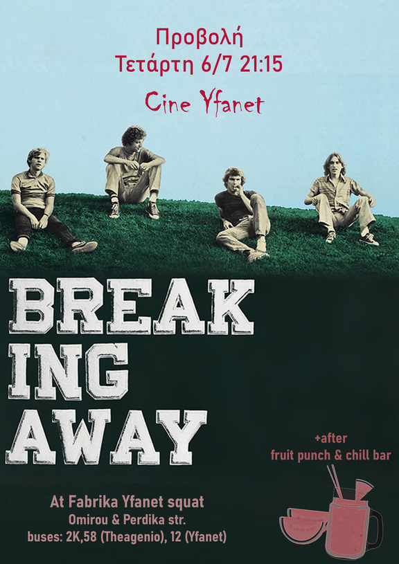 Τετάρτη 6 Ιουλίου στις 21:15 προβολή της ταινίας Breaking Away (1979) και after fruit punch chill bar από το Cine Yfanet