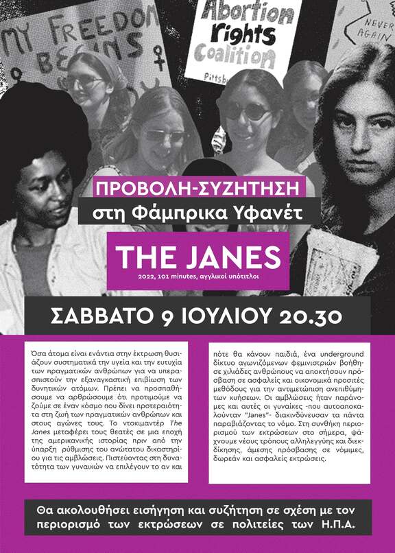 Όσα άτομα είναι ενάντια στην έκτρωση θυσιάζουν συστηματικά την υγεία και την ευτυχία των πραγματικών ανθρώπων για να υπερασπιστούν την εξαναγκαστική επιβίωση των δυνητικών ατόμων. Πρέπει να προσπαθήσουμε να αρθρώσουμε ότι προτιμούμε να ζούμε σε έναν κόσμο που δίνει προτεραιότητα στη ζωή των πραγματικών ανθρώπων και στους αγώνες τους. Το ντοκιμαντέρ The Janes μεταφέρει τους θεατές σε μια εποχή της αμερικανικής ιστορίας πριν από την ύπαρξη ρύθμισης του ανώτατου δικαστηρίου για τις αμβλώσεις. Πιστεύοντας στη δυνατότητα των γυναικών να επιλέγουν το αν και πότε θα κάνουν παιδιά, ένα underground δίκτυο αγωνιζόμενων φεμινιστριών βοήθησε χιλιάδες ανθρώπους να αποκτήσουν πρόσβαση σε ασφαλείς και οικονομικά προσιτές μεθόδους για την αντιμετώπιση ανεπιθύμητων κυήσεων. Οι αμβλώσεις ήταν παράνομες και αυτές οι γυναίκες -που αυτοαποκαλούνταν "Janes"- διακινδύνευσαν τα πάντα παραβιάζοντας το νόμο. Στη συνθήκη περιορισμού των εκτρώσεων στο σήμερα, ψάχνουμε νέους τρόπους αλληλεγγύης και διεκδίκησης, άμεσης πρόσβασης σε νόμιμες, δωρεάν και ασφαλείς εκτρώσεις.