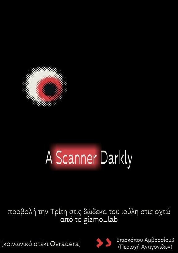 Προβολή της ταινίας "A Scanner Darkly" από το gizmo_lab, την Τρίτη 12 Ιουλίου στο κοινωνικό κέντρο Ovradera στις 20:00.