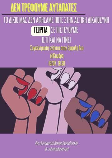 Καμία εμπιστοσύνη δεν έχουμε στην αστική δικαιοσύνη, αφού δεν είναι η πρώτη φορά που συγκαλύπτει και αφήνει ελεύθερους βιαστές ενώ προσπαθεί σταθερά και επανειλημμένα να υποβαθμίσει, να θάψει ή να χειριστεί με βάση τα πατριαρχικά στερεότυπά τις υποθέσεις αυτές. Γιατί εκείνο που οπλίζει τα χέρια των βιαστών και δολοφόνων, και ξεπλένει τα εγκλήματά τους είναι ένα ολόκληρο σύστημα, που έχει όνομα και λέγεται πατριαρχία, κράτος και καπιταλισμός. Οι δράστες γαλουχούνται, ενθαρρύνονται, οπλίζονται και στο τέλος καλύπτονται και δικαιολογούνται από τις κυρίαρχες αξίες και τους ίδιους τους μηχανισμούς. Γιατί η έμφυλη βία είναι συστημική βία και αποτελεί αναπόσπαστο κομμάτι της κρατικής και καπιταλιστικής βαρβαρότητα