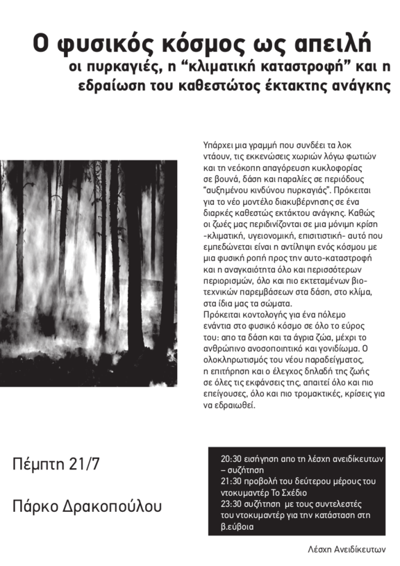 Υπάρχει μια γραμμή που συνδέει τα λοκ ντάουν, τις εκκενώσεις χωριών λόγω φωτιών και τη νεόκοπη απαγόρευση κυκλοφορίας σε βουνά, δάση και παραλίες σε περιόδους "αυξημένου κινδύνου πυρκαγιάς". Πρόκειται για το νέο μοντέλο διακυβέρνησης σε ένα διαρκές καθεστώς εκτάκτου ανάγκης. Καθώς οι ζωές μας περιδινίζονται σε μια μόνιμη κρίση -κλιματική, υγειονομική, επισιτιστική- αυτό που εμπεδώνεται είναι η αντίληψη ενός κόσμου με μια φυσική ροπή προς την αυτο-καταστροφή και η αναγκαιότητα όλο και περισσότερων περιορισμών, όλο και πιο εκτεταμένων βιο-τεχνικών παρεμβάσεων στα δάση, στο κλίμα, στα ίδια μας τα σώματα.