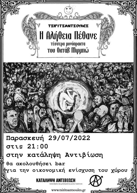 Οι Τσιριτσάντσουλες παρουσιάζουν την παράσταση "Η Αλήθεια Πέθανε" , τέσσερα μονόπρακτα του Οκτάβ Μιρμπώ, στην αυλή της Κατάληψης Αντιβίωση.