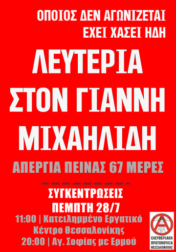 ΑΜΕΣΗ ΑΠΟΦΥΛΑΚΙΣΗ ΤΟΥ ΑΝΑΡΧΙΚΟΥ ΓΙΑΝΝΗ ΜΙΧΑΗΛΙΔΗ, ΑΠΕΡΓΟ ΠΕΙΝΑΣ ΑΠΟ 23/5