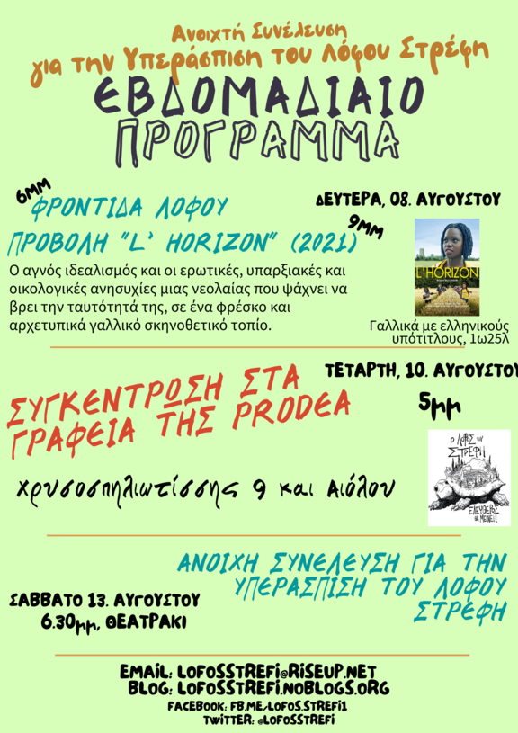 Το εβδομαδιαίο πρόγραμμα εκδηλώσεων για το Λόφο Στρέφη από την Ανοιχτή συνέλευση για την Υπεράσπισή του.