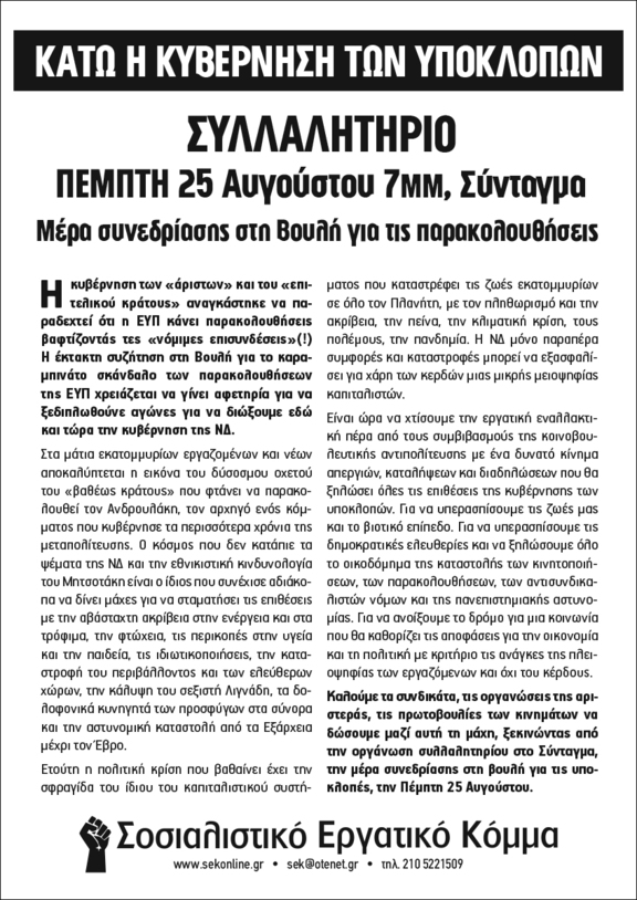ΚΑΤΩ Η ΚΥΒΕΡΝΗΣΗ ΤΩΝ ΥΠΟΚΛΟΠΩΝ - Συλλαλητήριο Πέμπτη 25 Αυγούστου, 7μμ, Σύνταγμα Μέρα συνεδρίασης στη Βουλή για τις παρακολουθήσεις
