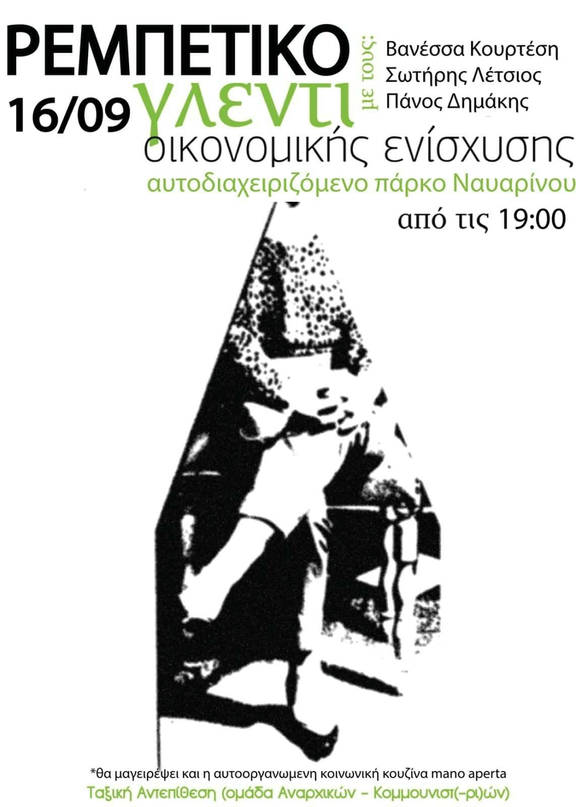 Ρεμπέτικο γλέντι οικονομικής ενίσχυσης για τα δικαστικά έξοδα συντρόφου μας για τις πρόσφατες συλλήψεις στα Εξάρχεια με αφορμή τις κινητοποιήσεις ενάντια στον εξευγενισμό, την κρατική καταστολή και την πολιτική απονέκρωση της γειτονιάς.