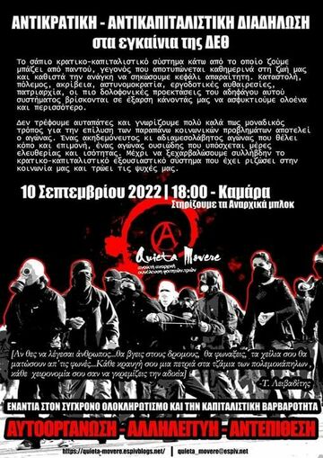 Επιλέξαμε, λοιπόν, να διοργανώσουμε τη συγκεκριμένη εκδήλωση τις ημέρες της αστυνομοκρατούμενης Θεσσαλονίκης, λόγω των εγκαινίων της ΔΕΘ, πιάνοντας το νήμα των αγώνων, της αντίστασης και της συλλογικοποίησης αυτών στους εργασιακούς χώρους, στις γειτονιές, στις πλατείες και όπου χρειαστεί.
