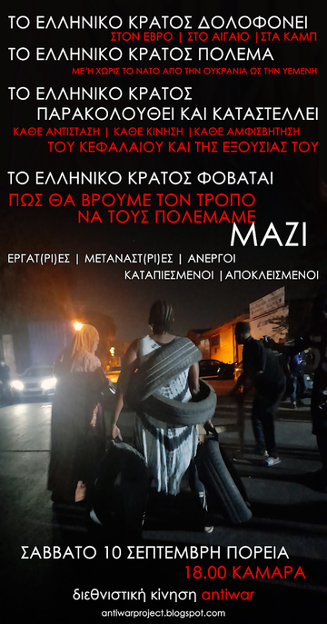 - Απέναντι σε μια κυβέρνηση που αδιαφορεί απολύτως για τις ανάγκες όσων την κατοικούν -ντόπιων και μεταναστριών- και δεν διστάζει, αν χρειαστεί για τα συμφέροντά της, να εμπλέξει την Ελλάδα σε έναν καταστροφικό πόλεμο.