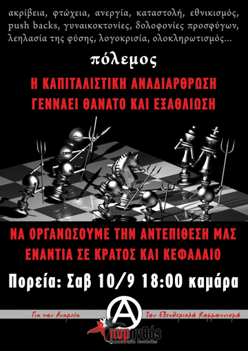 Απέναντι στην οργανωμένη επίθεση του κράτους και του κεφαλαίου, η μόνη λύση βρίσκεται στην Οργάνωση του αγώνα. Μέσα από αδιαμεσολάβητους αντιιεραρχικούς και ακηδεμόνευτους αγώνες από τα κάτω μπορούμε να περάσουμε στην αντεπίθεση ενάντια στην εκμετάλλευση και την καταπίεση, να παλέψουμε για την κοινωνική επανάσταση. Να ξαναφτιάξουμε τη ζωή με βασικά συστατικά την κοινωνική αλληλεγγύη, τη συνεργασία, χωρίς αφεντικά και δούλους.