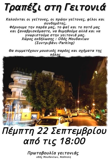 Πέμπτη 22 Σεπτεμβρίου, από τις 18:00 το απόγευμα μέχρι το βράδυ, το "Τραπέζι στην Γειτονιά".