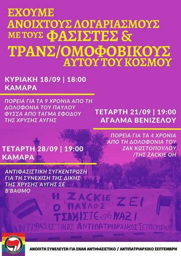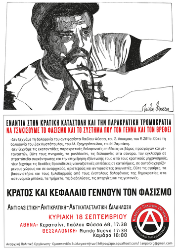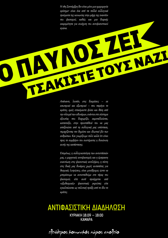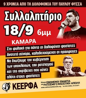 Εννέα χρόνια έκλεισαν από την μέρα της δολοφονίας του αντιφασίστα Παύλου Φύσσα από την φασιστική οργάνωση Χρυσή Αυγή. Η 18η Σεπτέμβρη είναι η μέρα όπου τα ριζοσπαστικά κομμάτια των αγωνιζόμενων επιλέγουν να βγαίνουν στον δρόμο όχι μόνο ενάντια στην χρυσή αυγή, όχι μόνο ενάντια στους οργανωμένους φασίστες, αλλά ενάντια στον κοινωνικό εκφασιμό, στους αποκλεισμούς, στο κράτος, στο σύστημα που γεννά τον φασισμό, που δεν είναι άλλο από τον ίδιο τον καπιταλίσμό. Στην αρχή του ίδιου έτους, στις 17 Ιανουαρίου του 2013, φασίστες της χρυσής αυγής δολοφόνησαν τον 27χρονο Πακιστανό εργάτη Σαχζάτ Λουκμάν. Έχουν περάσει 9 χρόνια από το περιστατικό της δολοφονίας αντιφασίστα και από τη δολοφονία Πακιστανού εργάτη, στα οποία αναδύθηκαν και οξύνθηκαν θεμελιώδεις αντιθέσεις αυτής της κοινωνίας. Το ελληνικό κράτος χρόνο με το χρόνο απομακρύνει τον όποιον ανθρωπιστικό του μανδύα και εμφανίζει την πραγματική του υπόσταση. Συγκροτεί, θεμελιωδώς, την εθνική του ενότητα μέσα από το γνωστό τρίπτυχο εθνικισμού, πατριαρχίας και θρησκείας, μέσω του οποίου γαλουχεί γενεές πολιτών, ανεξαρτήτου κυβέρνησης, με τη δράση του σε αυτή την κατεύθυνση να είναι ολοένα και πιο κλιμακούμενη. Η ακραία έκφανση της πολεμικής του είναι ενάντια στους αποκλεισμένους και δη στους μετανάστες και τις μετανάστριες. Σε μία περίοδο που δεν υπάρχει μεγάλη ανάγκη φθηνού εργατικού δυναμικού - σχεδόν δουλείας δηλαδή - οι μετανάστριες είναι στο στόχαστρο ενός μονεμερούς πολέμου. Απελάσεις, βασανιστήρια, κλοπές, δολοφονίες είναι μερικά από τα οποία συμβαίνουν στα σύνορα από μπάτσους, λιμενόμπατσους, καραβανάδες και διάφορους "νοικοκυραίους" φασίστες. Όσοι παρόλαυτα, λόγω πολιτικής πίεσης κάποια περίοδο ή λόγω καθαρής τύχης, διέσχισαν τα ελληνικά σύνορα και δεν απελάθηκαν παράνομα εκ των υστέρων, στοιβάζονται σε ΚΥΤ (κέντρα υποδοχής ταυτοποίησης) και κέντρα κράτησης. Αυτοί δε, που υπάρχουν εντός των αστικών κέντρων πιέζονται με κάθε μέσο να τα εγκαταλείψουν και να αποκλειστούν ακόμη περισσότερο εκτός αστικού ιστού. Χαρακτηριστικότερο παράδειγμα αυτή την περίοδο είναι το camp του Ελαιώνα όπου οι κάτοικοι μετανάστες και μετανάστριες αντιστέκονται σθεναρά στην προοπτική εκκένωσής του.