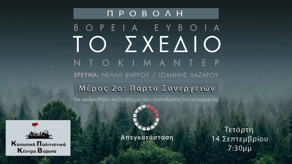 Το Κοινωνικό Πολιτιστικό Κέντρο Βύρωνα παρουσιάζει την Τετάρτη 14 Σεπτεμβρίου στις 7.30μμ στη Λαμπηδόνα το ντοκιμαντέρ «Βόρεια Εύβοια - ΤΟ ΣΧΕΔΙΟ Μέρος 2ο: Πάρτυ Συνεργειών».