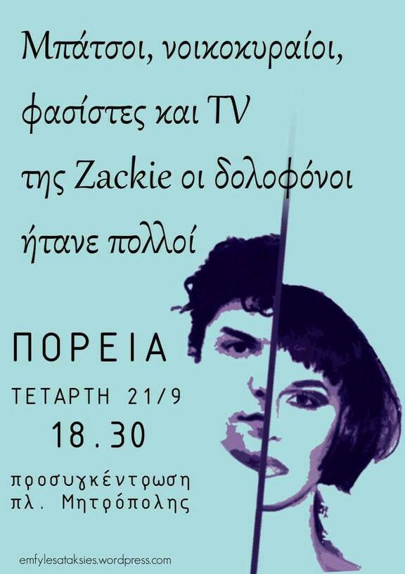 Το 2018 στην Ομόνοια, οι μικροαστοί μαγαζάτορες Χορταριάς και Δημόπουλος, λιντζάρουν και δολοφονούν τον/την ζακ/Zackie με συνεργούς την ελληνική αστυνομία και τα καθεστωτικά ΜΜΕ. Κάθε άτομο που απάρτιζε τότε την πατριαρχική ελληνική κοινωνία βιάστηκε να ταχθεί υπέρ του «ιερού δικαιώματος της ιδιοκτησίας» και κατά του «πρεζάκια ληστή». Όσο οι ζωές των φτωχών, των μεταναστριών, των τοξικοεξαρτημένων, των σεξεργατριών, των αναπήρων ορίζονται από το κράτος ως ζωές που περισσεύουν μέσα στην καπιταλιστική κοινωνία, τόσο η πατριαρχία, ο σεξισμός, η κουιροφοβία/ομοφοβία/τρανσφοβία, οι κοινωνικές ανισότητες και η τοξικοφοβία βρίσκουν χώρο για να οπλίσουν το χέρι κάθε φασίστα και κάθε μικροαστού δολοφόνου. 4 χρόνια μετά εμείς τασσόμαστε ακόμα με το μέρος των αοράτων και αγωνιζόμαστε για όλες τις ζακ αυτού του κόσμου, απέναντι στους διαχωρισμούς, την απελπισία και τον θάνατο.