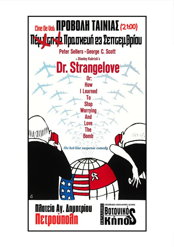 Λόγο ξαφνικών αλλαγών στο πρόγραμμα των μελών στη ομάδα προβολών, η ταινία Dr. Strangelove που ήταν προγραμματισμένη για Πέμπτη 22/9 θα πραγματοποιηθεί Παρασκευή 23/9 την ίδια ώρα.