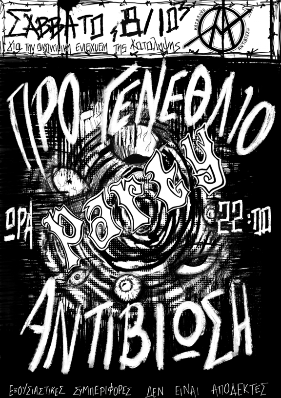 Το Σαββατο 8/10 παρτι για την οικονομική ενίσχυση της κατάληψης και συγκεκριμένα για τη διοργάνωση ενός τριημέρου για να γιορτάσουμε τα γενέθλια της Αντιβίωσης, που θα γινουν στις 21-22-23 Οκτωβρίου.