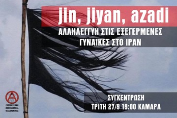 Τις τελευταίες μέρες διαδηλώσεις και συγκρούσεις λαμβάνουν χώρα σε περισσότερες από 80 πόλεις στο Ιράν με κεντρικό σύνθημα «Μας σκοτώνουν επειδή γεννηθήκαμε γυναίκες» και «Γυναίκα, Ζωή, Ελευθερία» . Χιλιάδες γυναίκες Ιρανές εξεγείρονται και διαδηλώνουν στους δρόμους, ενάντια στη επιβολή του χιτζάμπ, την καταστολή & το δικτατορικό καθεστώς. Τουλάχιστον 50 άνθρωποι έχουν χάσει τη ζωή τους από τις δυνάμεις ασφαλείας, ενώ τις τελευταίες ώρες αναφέρεται ο θάνατος άλλης μιας κοπέλας.