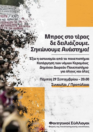 Ως απάντηση στην επίθεση που δεχόμαστε καλούμε Φοιτητικούς Συλλόγους, καλλιτεχνικές και πολιτιστικές ομάδες και καλλιτέχνες σε διοργάνωση συναυλίας ενάντια στην καταστολή στις 29/9 στα Προπύλαια.