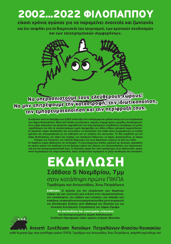 2002...2022 ΦΙΛΟΠΑΠΠΟΥ είκοσι χρόνια αγώνας για να παραμείνει ανοιχτός και ζωντανός και όχι τσιφλίκι για τη βιομηχανία του τουρισμού, των κρατικών σχεδιασμών και των επιχειρηματικών συμφερόντων.