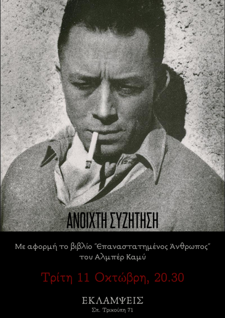 Ανοιχτή συζήτηση με αφορμή τον "Επαναστατημένο άνθρωπο" του Αλμπέρ Καμύ (δεν χρειάζεται να έχετε ήδη διαβάσει το βιβλίο -θα γίνει σύντομη παρουσίαση ορισμένων θεματικών κι έπειτα κουβέντα).