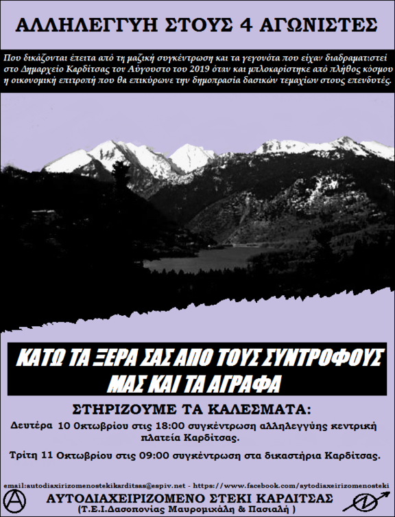 Στηρίζουμε την πορεία Αλληλεγγύης στους 4 διωκόμενους συναγωνιστές τη Δευτέρα 10 Οκτωβρίου στις 18:00 στην Κεντρική Πλατεία Καρδίτσας.