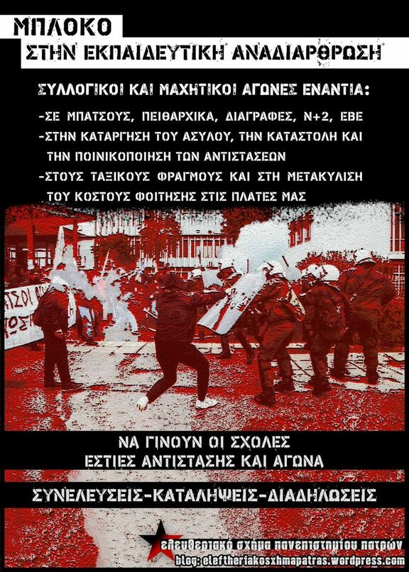 Βρισκόμαστε στο ξεκίνημα της νέας ακαδημαϊκής χρονιάς και η φετινή επιστροφή στις σχολές δε μπορεί να χαρακτηριστεί παρά μόνο ως κομβική. Μέσα σε ένα έντονο κλίμα τρομοκρατίας και σφοδρής καταστολής σε όλα τα κοινωνικά πεδία και τους αγώνες που εξελίσσονται- εκκενώσεις καταλήψεων, μετρό Εξαρχείων, απεργία στο εργοστάσιο Μαλαματίνα, κ.α - επιχειρήθηκε και η πρώτη είσοδος των ΟΠΠΙ στα πανεπιστήμια σε Αθήνα και Θεσσαλονίκη. Το κράτος προσπαθεί να τελειώσει με τις κοινωνικές και ταξικές αντιστάσεις σε κάθε επίπεδο ώστε να επιτύχει τους σχεδιασμούς του, με αποτέλεσμα το βάθεμα της εξαθλίωσης της κοινωνικής βάσης, αλλά ταυτόχρονα οχυρώνεται προληπτικά απέναντι σε οτιδήποτε μπορεί να αμφισβητήσει την κυρίαρχη αφήγηση.