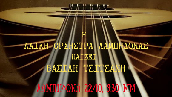 Το Κοινωνικό Πολιτιστικό Κέντρο Βύρωνα σας προσκαλεί στη συναυλία της Λαϊκής Ορχήστρας Λαμπηδόνας (Λ.Ο.ΛΑ) με τραγούδια του Βασίλη Τσιτσάνη στη Λαμπηδόνα στις 22/10/2022, και ώρα 9.30 μμ. Θα ακολουθήσει λαϊκό γλέντι.