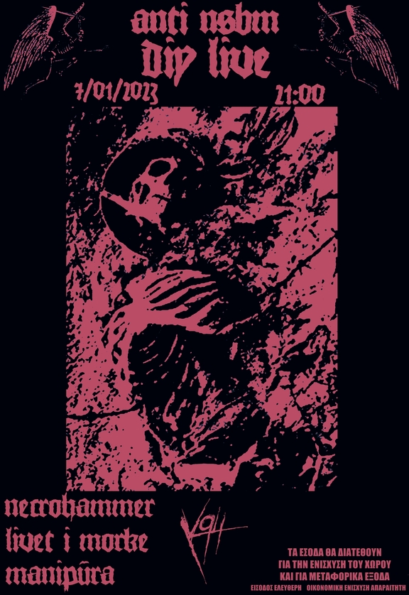 Το Σάββατο στις 7/1/23, από τις 21:00, στήνουμε παρέα με τους με Manipura(Αθήνα), Livet I mørke(Αθήνα), Necrohammer (Θεσσαλονίκη) , αυτοοργανωμένο Anti-N.S. Black Metal live.