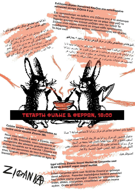 ہم آپ کو بدھ کی شام 6 بجے زیزانیا آنے کی دعوت دیتے ہیں _ ہم سب مل کر پکائیں گے اور مفت کھانا کھائیں گے جو ہم نے بازار سے جمع کیا ہے _ زیزانیا تمام پس منظر کے لوگوں، آمدنی، زبان، جنس، جنسیت اور عمر کے لوگوں کے لیے کھلا ہے _ وہاں پر ملتے ہیں _