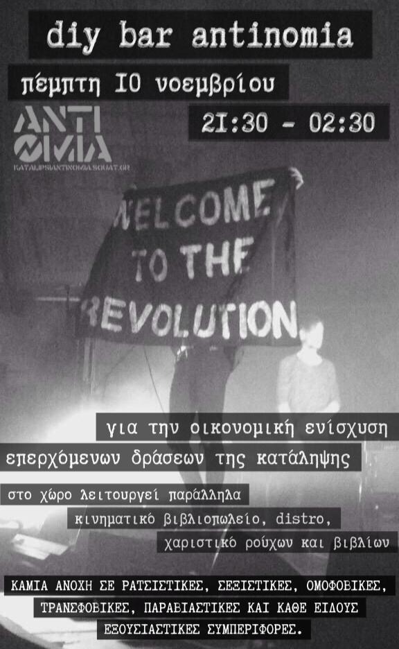 Πέμπτη 10/11 στις 21:30 DIY Bar στην Κατάληψη Αντινομία (π.ψυχιατρείο) για την οικονομική ενίσχυση επερχόμενων δράσεων.