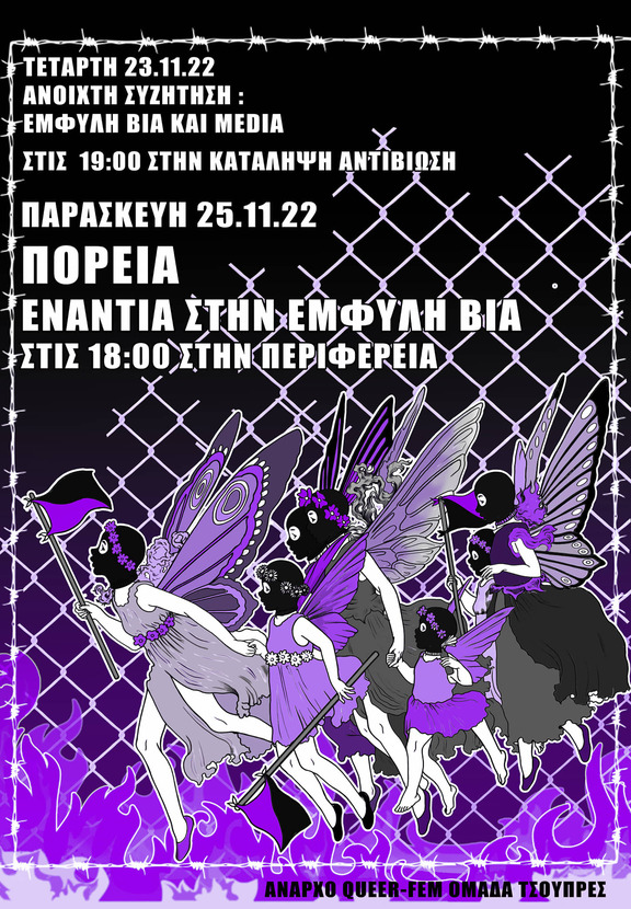 Με αφορμή την θεσμοθετημένη ημέρα κατά της έμφυλης βίας, αποφασίσαμε να καλέσουμε σε πανελλαδική κινητοποίηση φεμινιστικών/κουίρ συλλογικοτήτων, με στόχο μας μαζικές πορείες και άλλου τύπου δράσεις. Αντιλαμβανόμαστε παράλληλα, πως η έμφυλη βια δεν ορίζεται ούτε απο θεσμούς, ουτε είναι κάτι που θυμόμαστε μόνο επετειακά. Αποφασίζουμε να εργαλειοποιούμε μέρες σαν κι αυτήν για να εξωτερικεύουμε τον λόγο μας και να αντιπροτείνουμε διαφορετικούς τρόπους αγώνα απο αυτούς της κυριαρχίας.