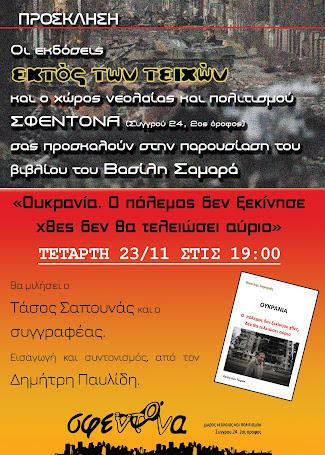 Οι εδόσεις "εκτός των τειχών" και η Σφεντόνα σας προσκαλούν στην παρουσίαση του βιβλίου του Βασίλη Σαμαρά "Ουκρανία. Ο πόλεμος δεν ξεκίνησε χθές, δεν θα τελειώσει αυριο".