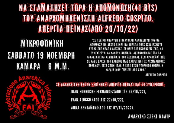 Μικροφωνική αλληλεγγύης στον αναρχομηδενιστή Alfredo Cospito. Απεργία πείνας από 20/10/2022.