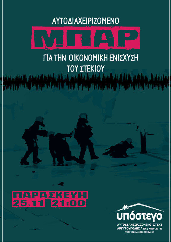 Παρ. 25.11 | 21:00 | Αυτοδιαχειριζόμενο bar | Τα έσοδα θα διατεθούν για την οικονομική ενίσχυση του χώρου | παραβιαστικές/σεξιστικές/εξουσιαστικές συμπεριφορές μη αποδεκτές