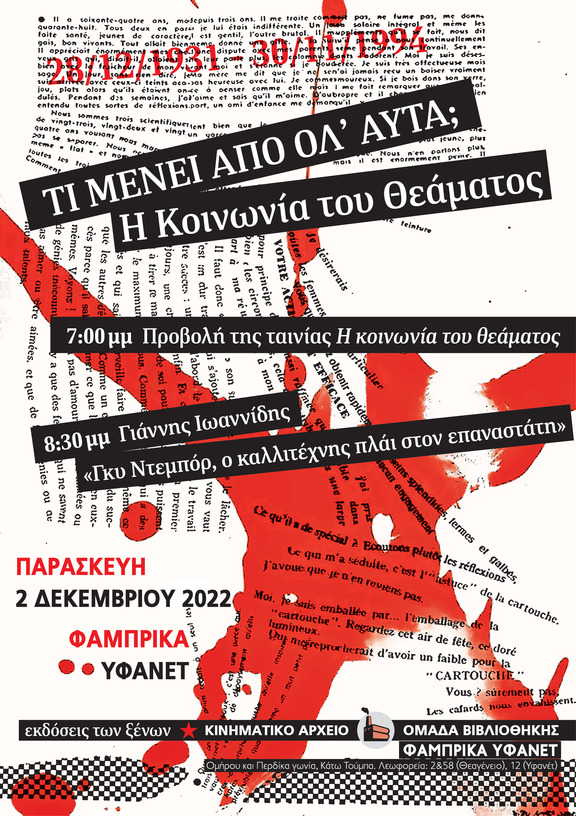 Η Ομάδα βιβλιοθήκης, βιβλιοπωλείου και κινηματικού αρχείου Φάμπρικας Υφανέτ μαζί με τις εκδόσεις των ξένων διοργανώνουν προβολή και συζήτηση με θέμα : " Τι μένει από όλ' αυτά; Η κοινωνία του θεάματος"